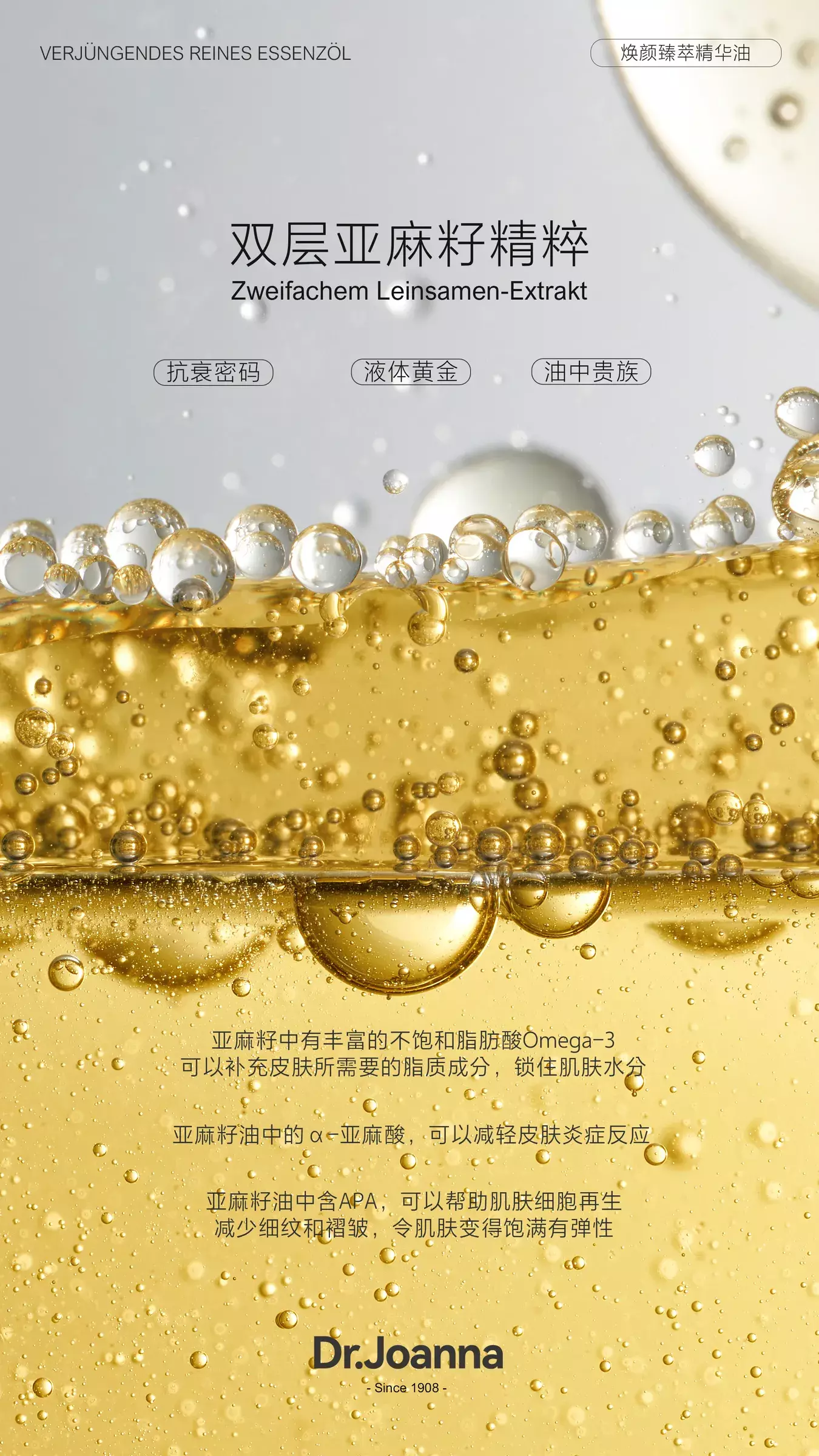 文献里面记载亚麻籽油也能够去刺激这样子的胶原蛋白跟弹力蛋白的一个再生,那个让我们的皮肤在抗皱的同时会有那种膨弹感,亚麻籽油也有肽的组合,可以完美解决问题。